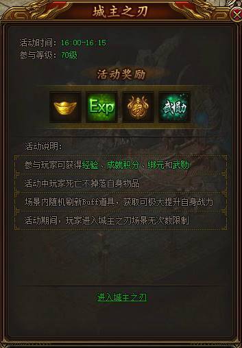 城主之刃活动是成就令牌的重要产出地,除此只外玩家还能获得绑定元宝、海量经验和武勋的丰厚奖励。
