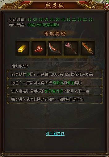 威灵狱和获得大量淬炼石和绑金,并掉落丰厚的武器装备。