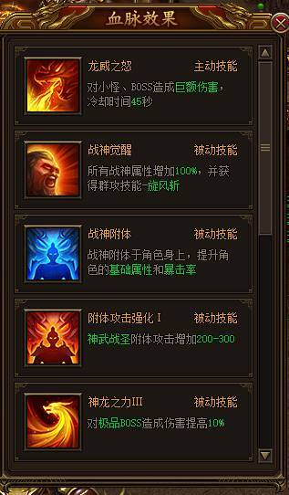 战神觉醒:被动技能,所有战神属性提高100%、获得群攻技能,并改变战神武器特效、周身特效、攻击特效